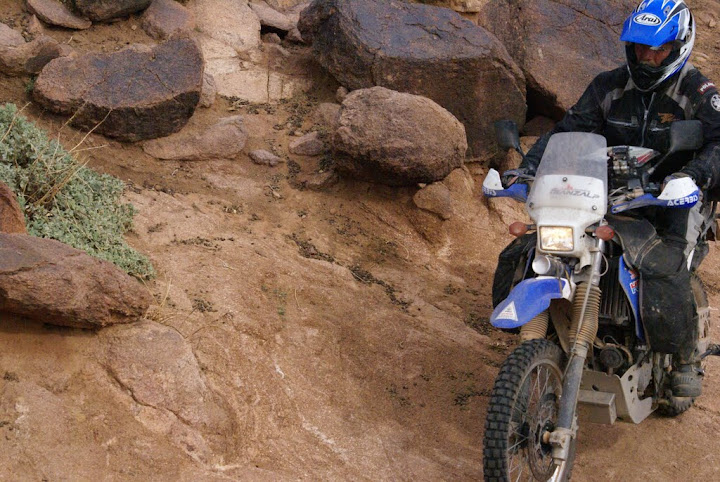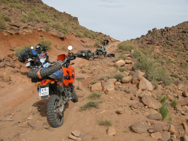 No to jedziemy na tę pistę. Scott napisał w Morocco Overland, że to trudniejsze niż cokolwiek co można znaleźć w jego książce. Że trzeba być przygotowanym na to, że czasem droga jest nieprzejezdna i jedyne pojazdy jakie w ogóle można na niej spotkać to motocykle i terenówki, które szukają wyzwań. Napisał, że parę razy próbował, ale w końcu przejechał tę drogę motocyklem. Okupił to jednak krzywą felgą, zruinowanym zawieszeniem i dziurą w skrzyni korbowej. I że cieszył się jak dziecko, że nie pojechał załadowanym dużym GSem tylko małą tenerką. Sprawdzimy... Scott zapowiada, że 54 kilometry mamy pokonać w 5 godzin. Nie ma żartów. Pierwszy odcinek znamy z wczoraj więc jedziemy bez większych problemów, kilometr za kilometrem w górę. Dojeżdżamy do rozjazdu na 38 kilometrze w niecałą godzinkę i zatrzymujemy się. Tu rozchodzą się MH5 i MH10 po to, by spotkać się 17 kilometrów dalej. Proponuję podzielenie grupy. Namawiam Artka i Pekaesa by pojechali MH10, którą wczoraj pokonaliśmy z Franzem. Jest prześliczna i niespecjalnie trudna. Reszta ekipy pojedzie „na skróty” starą drogą MH5. Jak długo można jechać 17 kilometrów? Umawiamy się za półtora godziny w miejscu, w którym łączą się obie drogi. Początek nie jest trudny, ale daje się zauważyć, że mniej pojazdów tędy jeździ. Nie ma żadnych śladów opon i wiem że nie zwiastuje to niczego dobrego. Pchamy się dalej, ale już sobie myślę, że jak będzie za trudno to zawrócimy. Ważne żeby wiedzieć kiedy... Na razie jednak droga nie ma w sobie nic ekstremalnego. Dość łagodnie wznosi się w górę, ale wiem że przełęcz ma blisko 1900 metrów. Jesteśmy otoczeni przez wysokie góry i nawet nie próbuję się domyślać którędy mamy jechać, wygląda na to że się nie da, ale już wiele razy w górach tak mi się wydawało. Rozstaliśmy się na 1300 więc trzeba wyjechać 600 metrów do góry. Niby nie tak dużo wspinaliśmy się przecież na różne czterotysięczne przełęcze a i kilka miało powyżej pięciu kilometrów. Jeżdżenie po górach to zupełnie inna bajka niż pustynie, błota, piachy. Jeśli mam wybierać to zawsze wskażę na góry - tam nie sposób się nudzić. Nie tylko pogoda, ale i droga może się zmienić w okamgnieniu. Kiedyś na Urdele wjechałem z pasażerką i bagażem – na siracach, innym razem nie dałem rady sam, na lekko będąc na kostkach. Kizył Art między Kirgizją a Tadżykistanem wspominam jako niezły hardkor z września 2006, później przejeżdżałem ją kilka razy bez większych kłopotów. Tutaj w Maroku teren jest bardzo surowy, Jebel Sarhro przez który przejeżdżamy to część Antyatlasu. Po jego przejechaniu będziemy już w Atlasie Wysokim. Bezpośrednie sąsiedztwo z Saharą daje podobne „bogactwo” roślinności. Nie ma drzew, ani nawet krzaków. Przynajmniej nie będzie w co przypieprzyć. Są za to kamienie, ba spore głazy. Mam koło z KTMa, Puszek również. Wiele złego słyszałem o obręczach, oględziny puszkowej felgi potwierdzają, że to jakaś pomyłka była. Moja choć dużo starsza wygląda jednak bez zarzutu. Od dwóch dni ślizga mi się rolgaz, klej którym była sklejona grzana manetka pod wpływem saharyjskiej temperatury puścił i muszę co kilkanaście minut wracać w położenie zero, bo na odkręcanie nie pozwala naciągnięty kabel zasilający. Zjeżdżam z niewielkiej górki, coś szarpnęło przodem, motocyklem zarzuciło, pociągnąłem gaz i nic... Z lewej strony jest ze 4 metry spadku i w tamtym kierunku podąża moja babcia. Wszystko trwa sekundę, może dwie. Wystarczy jednak, by się spocić. W ostatniej chwili oddzielam się z motocykla i na czterech kończynach uciekam w prawo. Leżąca na prawym boku babcia ze zgrzytem sunie w stronę „przepaści”. Zatrzymuje się jednak na jej skraju, przednie koło wisi już poza drogą. Było blisko końca przygody i początku następnej. Nadjeżdża Marek, a za chwilę Puszek. Marek pomaga mi wyciągnąć Afrykę na drogę, Puszek pomimo moich próśb najpierw zdejmuje kask i ustawia go na swoim motocyklu uruchamiając kamerę, by uwiecznić ten moment. Dostaję piany, aż się gotuję w środku. W dupie mam taką pomoc. Nawet nie próbuję trzymać języka na wodzy i znowu pada między nami cięższa wersja „odejdź szybko”. Wkur... przez Puszka nie potrzebuję pomocy, jestem tak wpieprzony, że wolałbym ją samemu zrzucić niż z nim wyciągać. Wtedy dopiero zrozumiałem czemu tak strasznie ciskał się Mateo w Himalajach, gdy Jojna ustawił się z aparatem w najtrudniejszej kamiennej sekcji i zamiast mu pomóc w przejeździe pstrykał fotki jak się wywraca. Razem z Markiem wyszarpujemy motocykl na gumy. Babcia straciła fason i jedno oko. Ale wygląda jeszcze hm... bardziej bojowo. Puszek ocalał. Dojeżdżamy na 47 kilometr, po prawej stronie stoi kilkumetrowy obelisk z napisem 1710 metrów, upamietnia jakąs zwycięską bitwę Legii Cudzoziemskiej z Berberami w 1933 roku. Demontuję manetkę z gazem i poprawiamy ją z Franzem. Teraz niestety będzie zbyt ciężko wracała. Ruszamy w dół do sporej kotliny i zaczyna się robić trudniej. Na drodze jest sporo luźnych kamieni, powoli zsuwamy się niżej i niżej. Franek przemyka szybko wyprzedzając mnie bez kłopotów. Jak dla mnie trochę za odważnie, a może to ja jestem w lekkiej panice po niedawnej przygodzie? Reszta też jedzie wolniej. Droga doprowadza nas do rzeki, w której kompletnie zanika. Wody oczywiście nie ma, są jednak duże kamienie i musimy się mocno nagimnastykować klucząc między nimi. Co chwila się zmieniamy na prowadzeniu, widać że mamy nieco inną technikę jazdy. A może raczej powinienem napisać: mamy różne braki w technice jazdy. Franz jednak wyraźnie radzi sobie najlepiej z nas. http://lh5.ggpht.com/_xeUBXqZ9eQQ/TN...0/IMG_0328.JPG Przejeżdżamy kilkaset metrów rzeką, droga „odnajduje” się po prawej stro