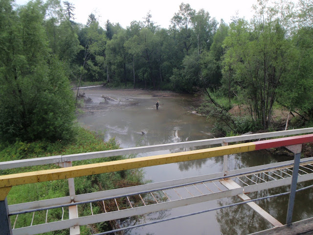 Łazimy, patrząc którędy da się przez nią przejechać. Ma ok. 40 m szerokości, nurt szybki. Miejscami jest głęboko. Jak znajdziesz możliwość przejazdu na ¾ jej szerokości, to potem okazuje się że ¼ nie przejedziesz, bo jest głęboko. Po moście drogowym, jakimkolwiek, śladu brak. Bywały stare drewniane, lekko zdezelowane, ale były. Obok jest most kolejowy. Próbujemy zobaczyć jak da się na niego wjechać. Przedzieramy się przez krzaki. Żeby na niego się dostać, trzeba pokonać nasyp z luźnych kamieni. Wjeżdżając między szyny, można szybko przejechać na drugą stronę. Dobra, wjechać się da, przejechać też, ale jak zjechać? Na końcu mostu jest zjazd schodami betonowymi, które są całe pokruszone ze starości. W miejscu gdzie się kończą, na nasypie leżą ułożone płyty betonowe, porośnięte mchem, śliskie, że zjeżdżaliśmy z niej jak na nartach. Dalej już szukamy możliwości powrotu na drogę. Deszcz pada cały czas. Dookoła cisza, słychać tylko padający deszcz. Decyzja, próbujemy mostem, najpierw jeden motocykl, potem drugi. Izi za kierownicą, ja z tyłu pcham na nasyp. Rzuca we wszystkie strony, ale wjechał. Patrzymy, czy nie jedzie pociąg, ale cisza. Z trudem przepychamy przednie koło przez szynę, ale z tylnym już jest problem! Szerokość torów jest taka, że gdy motocykl jest prostopadle to szyn, to w momencie jak tył próbuje wjechać, to przód opiera się o zewnętrzną szynę. K…a udało się. But i do zjazdu na końcu mostu. Ale o co chodzi?! Nie możemy wyciągnąć dryndy z szyn, ślizga się we wszystkie strony, patrzymy a to w lewo, a to w prawo czy oby pociąg nie nagina. Klniemy po nosem. Prostopadle się nie da, bo jest nasyp, jak przód wyjedzie, a tył dojeżdża do szyny, to znowu przednie koło zwisa z nasypu (nie wiem czy wiecie o co chodzi). Trzeba bokiem, koło się ślizga. W końcu się udaje! Powoli zjeżdżamy ze schodów. Beton się sypie. Tyle ile się da, skręcamy kierownicą, resztę nadrabiamy zarzucając tyłem.